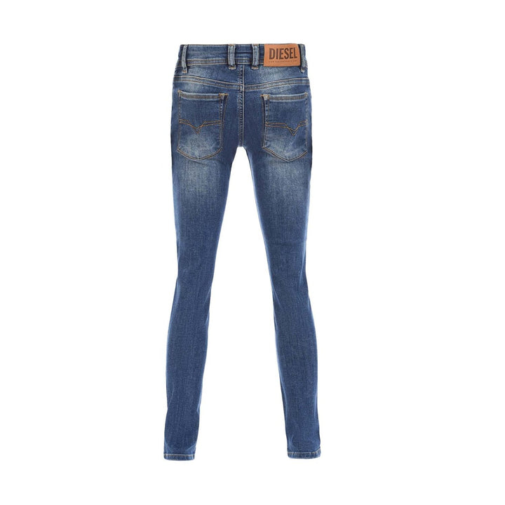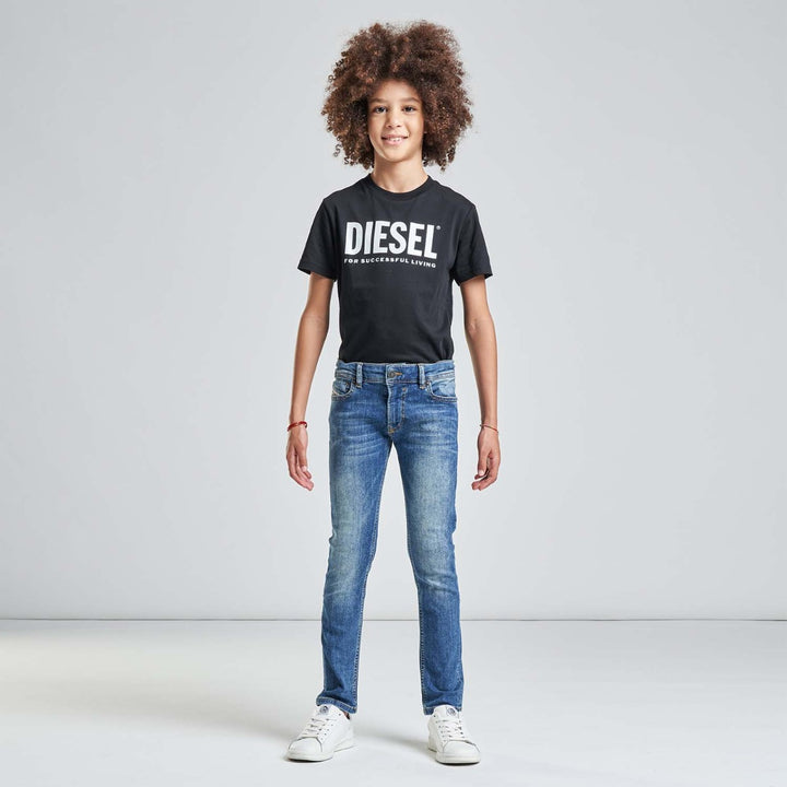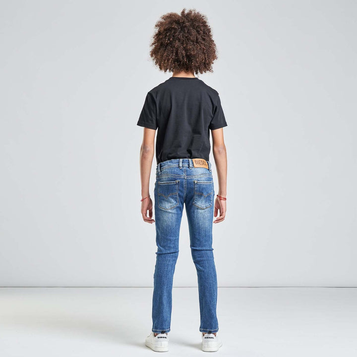 Diesel kids straight cut blue cotton jeans; five-pocket model, classic design, front closure with zip and button.