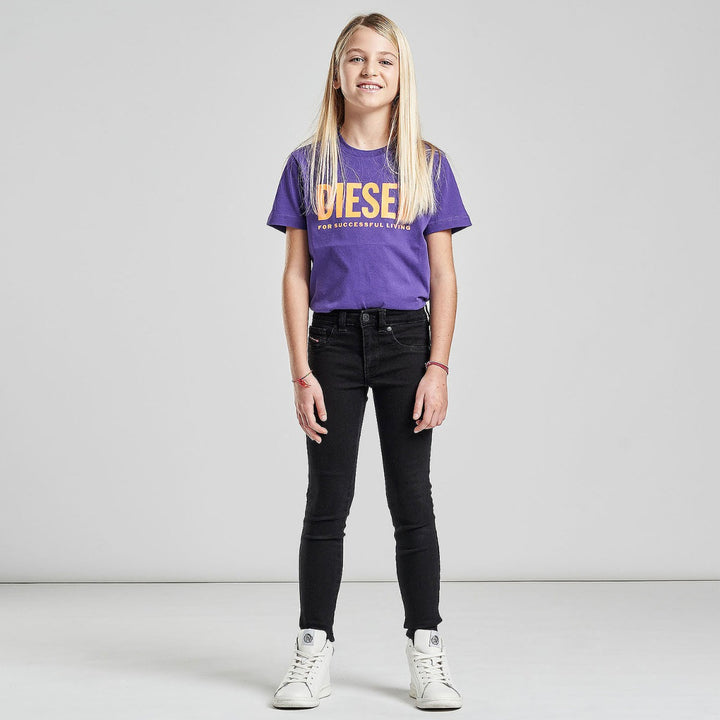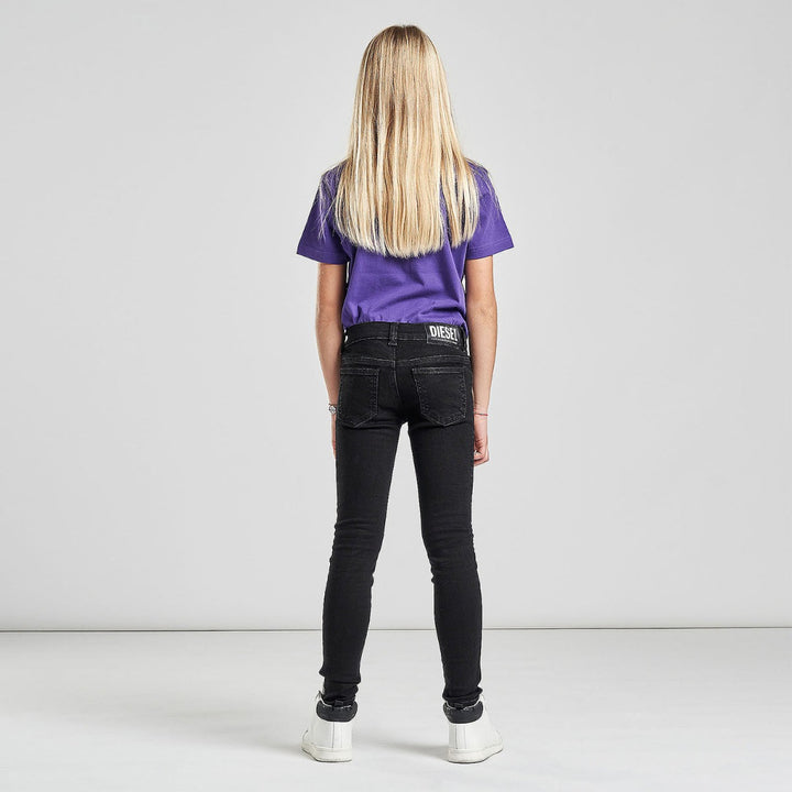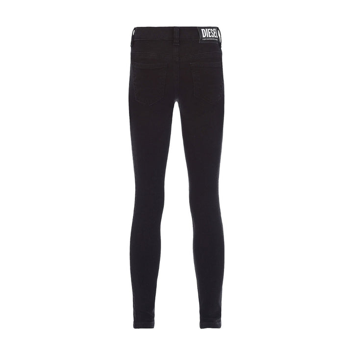 Black skinny jeans for girls by Diesel, made in soft stretch denim. In a classic five pocket style, they have a logo tab on the back and a vintage logo patch on the coin pocket. There is a useful adjustable waist and they fasten with a zip and button.