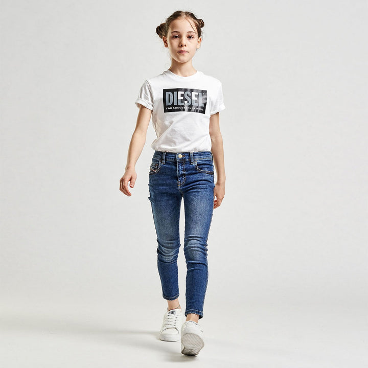 Mid-blue skinny fit jeans for girls by Diesel, made in soft cotton denim, with a little stretch. They have a washed and worn look, with distressed details. In a classic five pocket design, there is a black logo tab on the back and a vintage style logo on the coin pocket. They have an adjustable waist and a zip and button fastening.