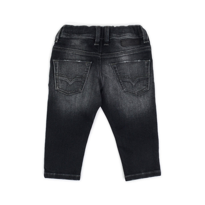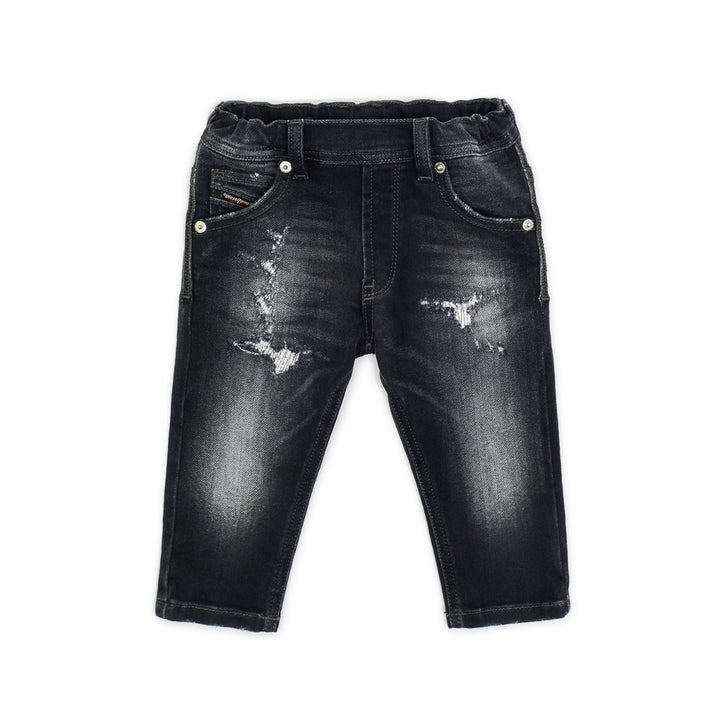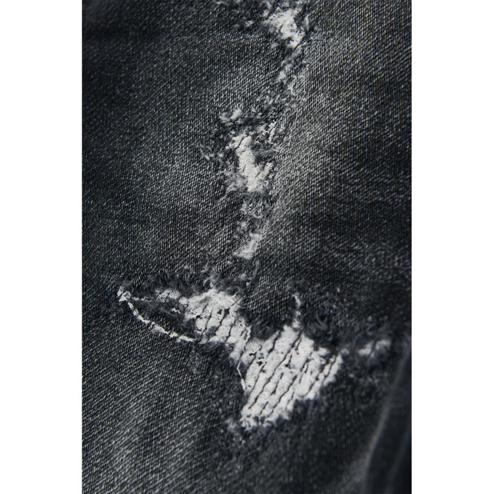 Regular-fit style crafted from JoggJeans® for the utmost comfort. This dark grey wash features a used look and feel, created through ripped and repaired detailing, zig-zag stitching and underlay patches.
