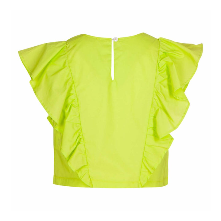It's a trendy ruffled sleeve green top made of breathable cotton fabric that your little daughter will love to wear with different bottom wear like a skirt, trousers, denim pants, shorts, and leggings. For easy dressing, the top is designed with a button closure at the back, and the ruffle sleeve design till the waist area is adding style factor to the top. It is also designed with an embroidered brand slogan on the front. Find it as a comfortable cotton top addition to your little one’s wardrobe. | \