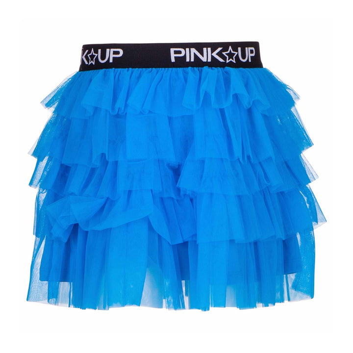 Here this is a trendy blue ruffled skirt that your daughter is sure to fall in love with. This pretty ruffled skirt by Pinko is designed to make it beautiful with blue ruffle layering that gives it a stylish look. The black elasticized waistband with the logo embroidered on it is adding to its charm. Just getting your baby girl dressed in this skirt with any of her casual shirts, tops or t-shirts will make her instantly ready to hit the party. Just accessorize her looks with a pretty hair accessory and matching footwear. | \