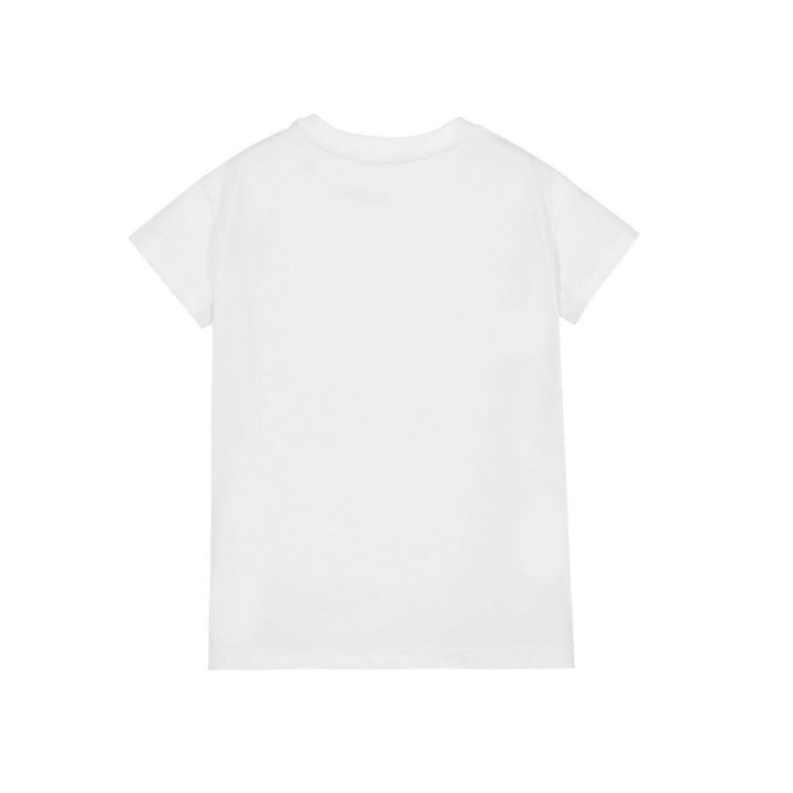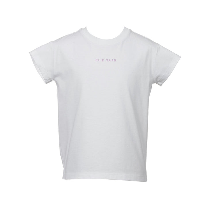 Teen girls white cotton jersey dress by luxury brand Ellie Saab. The black logo is embroidered and embellished with matt sequins.