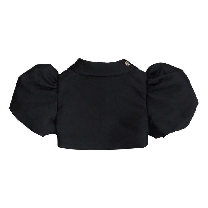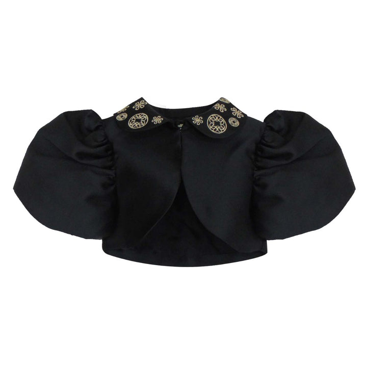 Gorgeous black bolero jacket for girls by luxury designer Elie Saab. Perfect for a special occasion, it is made in mid-weight silk blend satin with large, puffed bubble sleeves. The collar glistens with flowers and logos beautifully embroidered in gold thread. It is fully lined in white satin and neatly fastens with a hook and eye under the chin.