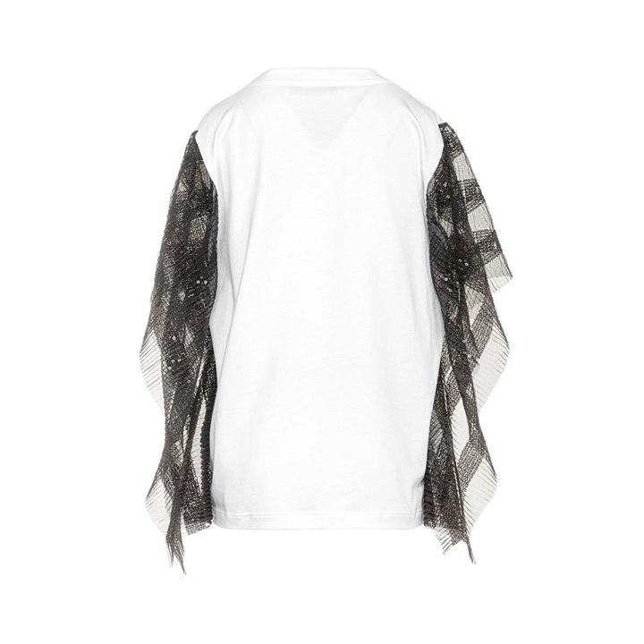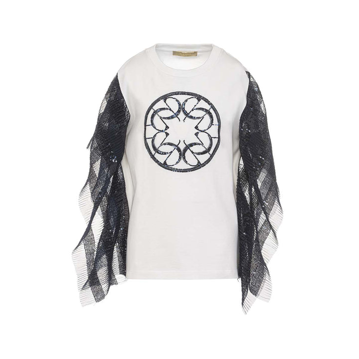 White Logo Sequin Embroidered Top with Black Frilled Sleeves