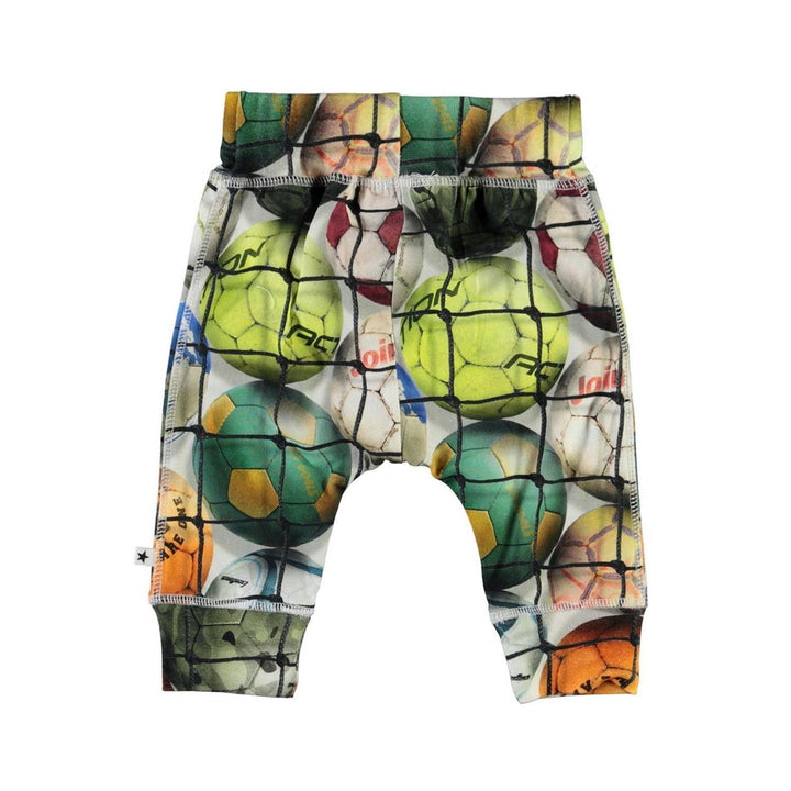 Sammy is a pair of roomy baby trousers with a colourful print of footballs behind a net. They are in a sweatpant look with wide, elastic rib at the waist and legs.This Molo product is GOTS certified, which means it is made with certified organic materials and produced under the strictest social and environmental standards throughout the entire manufacturing process. In addition, the GOTS certification means that the product is free of hazardous chemicals. Certified by Ecocert Greenlife, certification number: 197496.