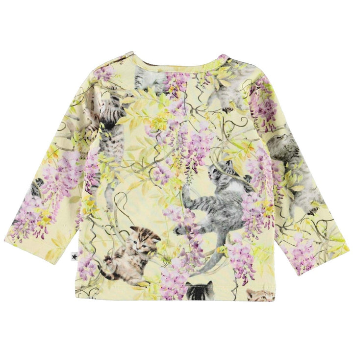 Eva is a light yellow baby top with a print of kittens that are climbing up wisteria. It has a single easy snap closure on one shoulder. This Molo product is GOTS certified organic, which means that it is made with certified organic materials and produced under the strictest social and environmental standards throughout the entire manufacturing process. In addition, the GOTS certification secures that the product is free of hazardous chemicals. This Molo product is GOTS certified organic by Ecocert Greenlife, certification number 197496.