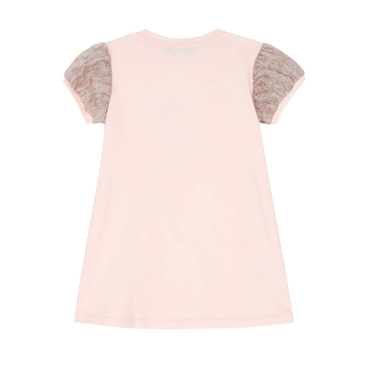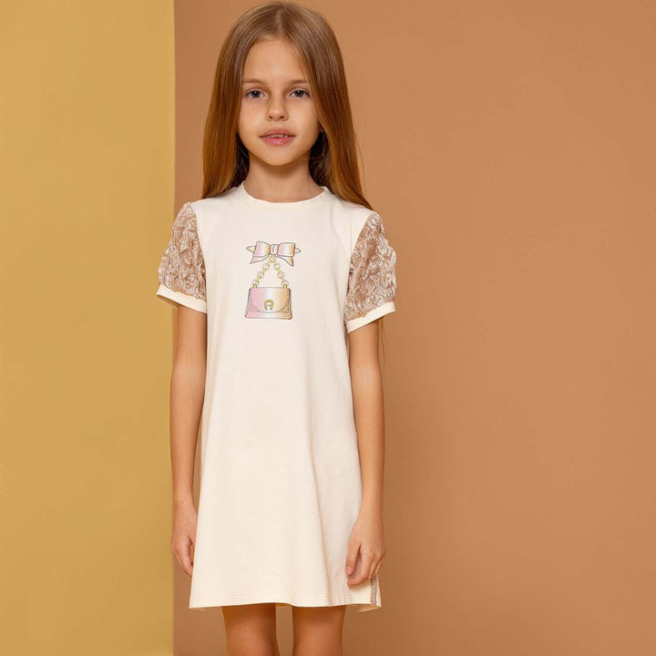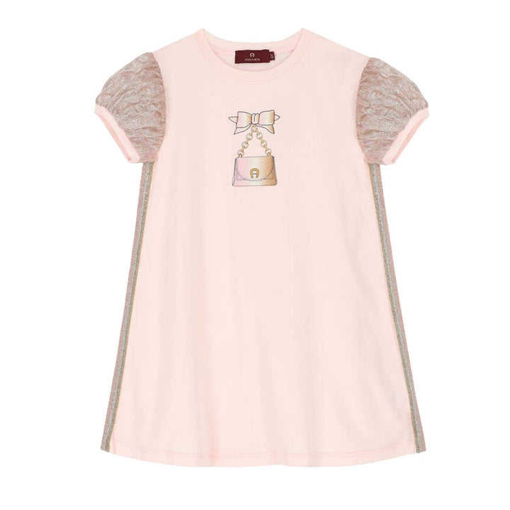 Pink dress for girls by Aigner. Made from soft cotton jersey with gold puffed sleeves and features a beige and pink ombre sparkly Aigner handbag print on the front. The side seams are trimmed with gold tape.