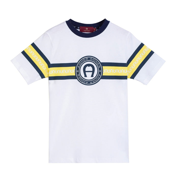 White T-shirt for boys by AIGNER, made in soft cotton jersey. It has a yellow and navy blue stripe across the front, with a white horseshoe logo pattern and a large logo crest in the middle.