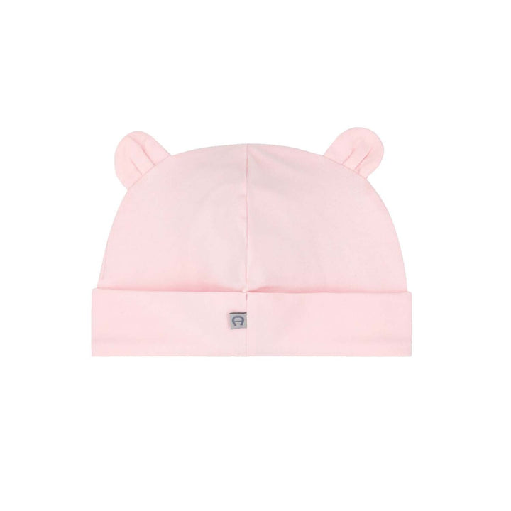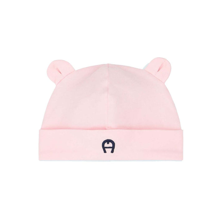 Pink logo hat for baby girls by Aigner. Made from soft cotton, it features the brands iconic horseshoe logo embroidered in navy on the front and it has ears on the top.