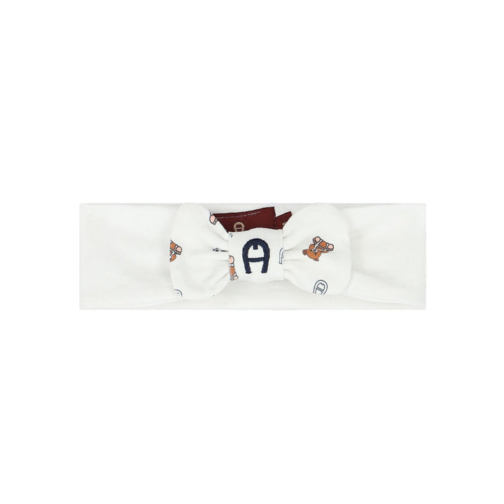 White logo headband for baby girls by Aigner. Made from soft cotton, it features bow with a teddy bear and logo print pattern and the brand's iconic horseshoe logo embroidered in navy on the front.