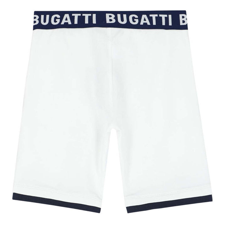 White logo shorts for boys by Bugatti Junior. Made from soft cotton, it features the brands logo rubber badge on one leg and it has dual side pocket. An logo elasticated waistband and drawstring for comfortable fit.
