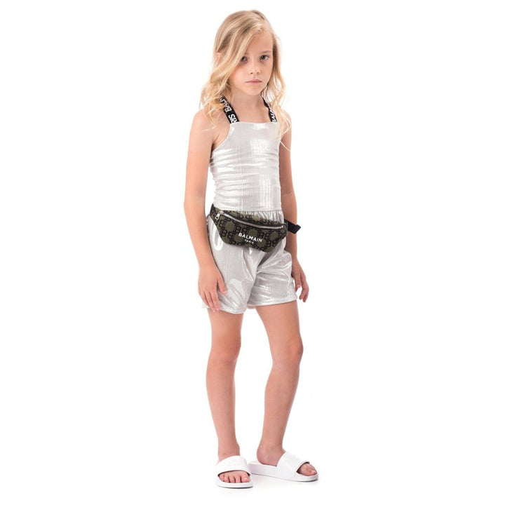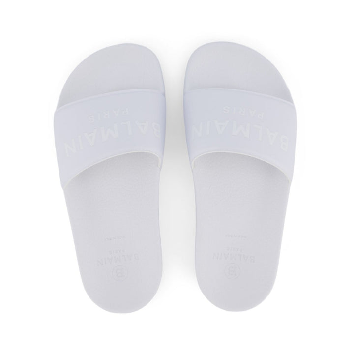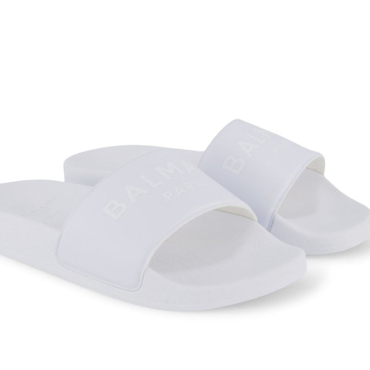 White flat logo slides from Balmain Kids featuring a printed logo to the front, a branded insole, a flat rubber sole, a slip-on style and an open toe.