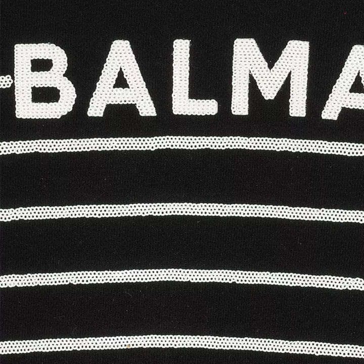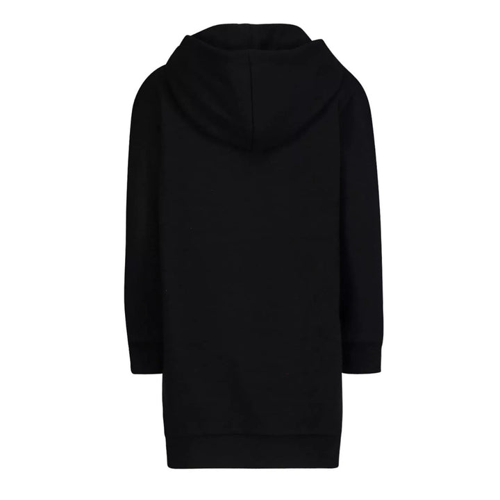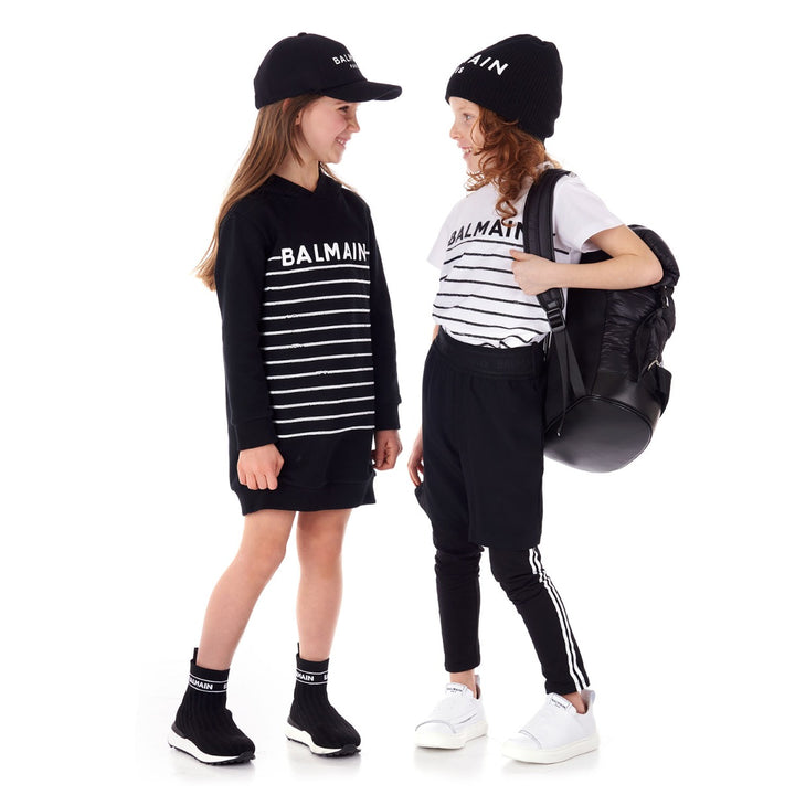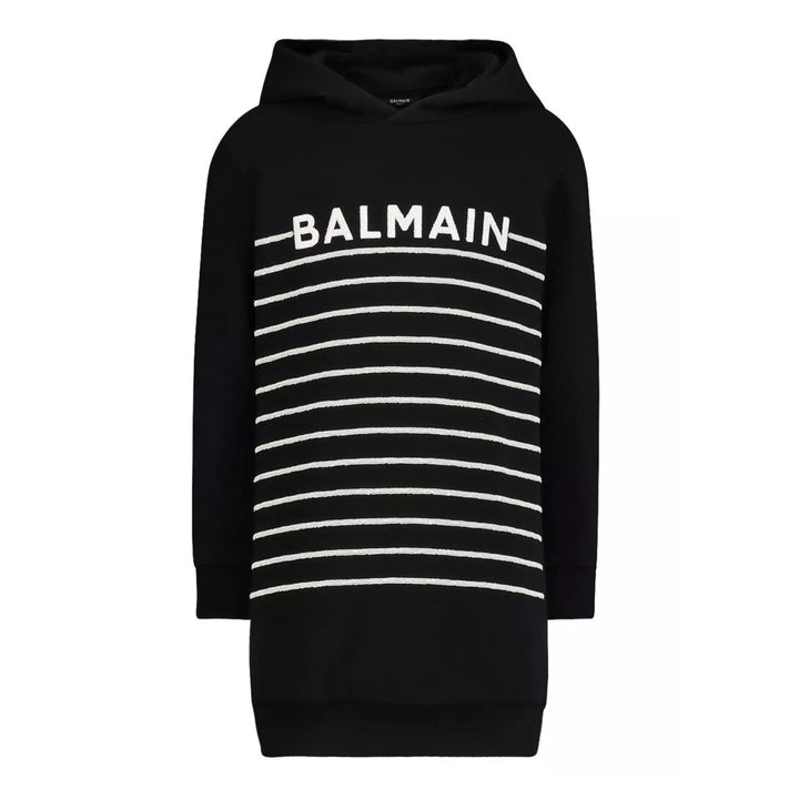 Casual black hoodie dress for girls, by luxury French brand Balmain. Made from soft sweatshirt jersey, it has a classic white Balmain logo on the front, in a white sequin design.
