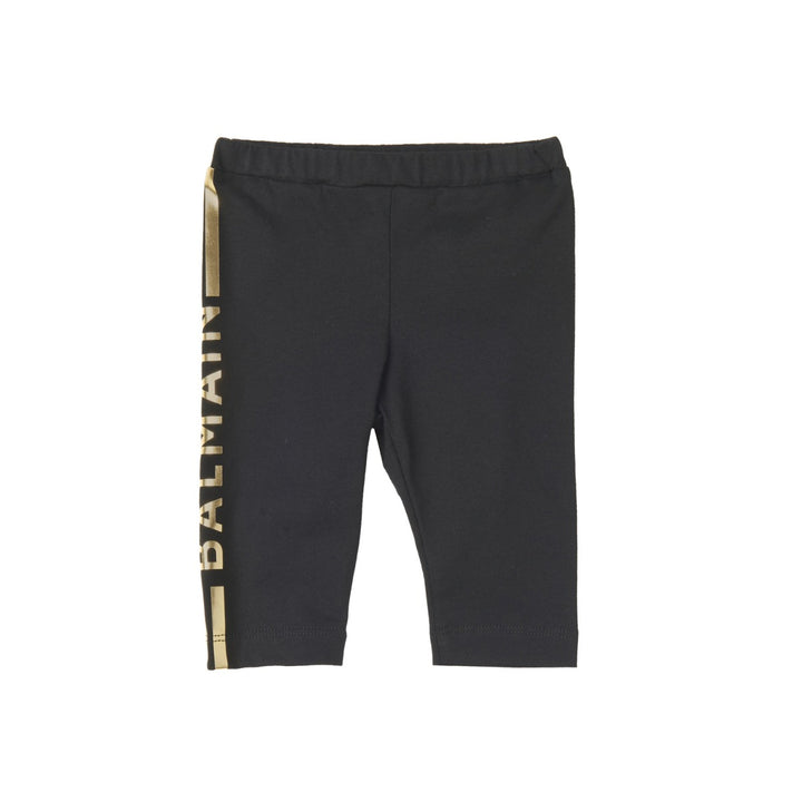 Younger girls luxury black leggings by Balmain. Soft and stretchy, they have a gold logo print down one leg. They have an elasticated waistband for comfort.