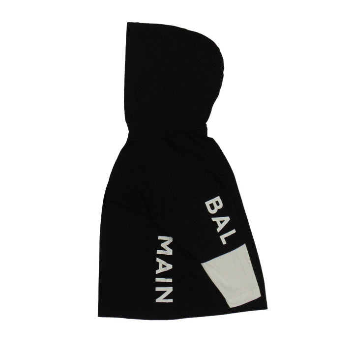 This super stylish black hoodie t-shirt by Balmain is a must-buy for your kid. The complete black t-shirt with hoodie features a brand logo print on one side with half black and half white sleeves. The brand print, the hoodie of the t-shirt, and the half white and black sleeves altogether make it a super stylish t-shirt for your little boy to wear and flaunt.