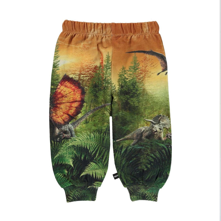 Molo x Jurassic World. Simeon is a pair of baby sweatpants with a print of various dinosaurs in a forest. They have ties at the waist and elastic rib at the legs. Molo is proud to present our fantastic international partnership with Universal Studios for the long-anticipated film Jurassic World Dominion. The partnership consists of an exciting collection where the spectacular dinosaurs come to life in\