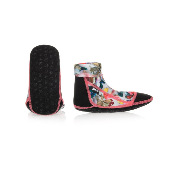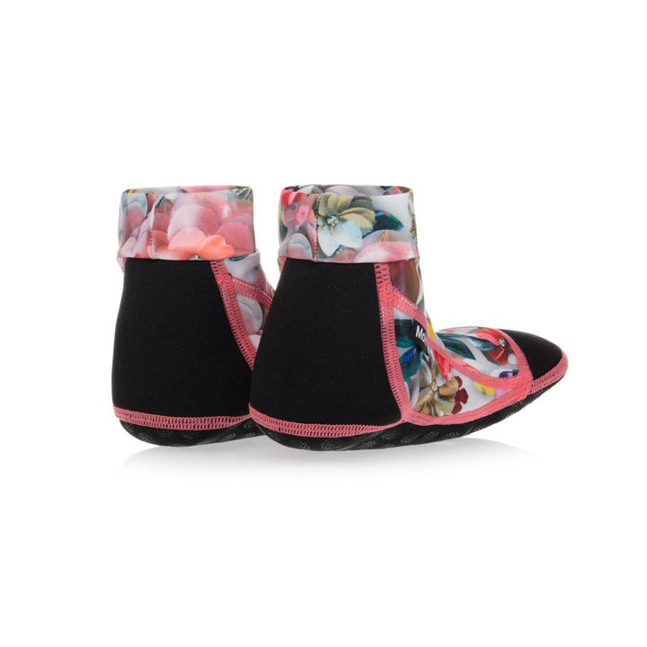 Black and floral pink aqua shoes for girls by Molo. Made from soft and stretchy recycled polyester, they have non-slip soles.