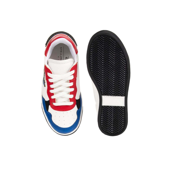 A pair of white faux leather trainers for boys and girls by Stella McCartney Kids, part of the Disney Fantasia capsule collection. Featured in rainbow stripes embroidery on the sides is the famous Fantasia Mickey Mouse. This lace-up style has contrasting red, blue and black trims and black rubber logo patch at the heels. They are lined in soft fabric for comfort and have a white and black non-slip rubber outsole.\