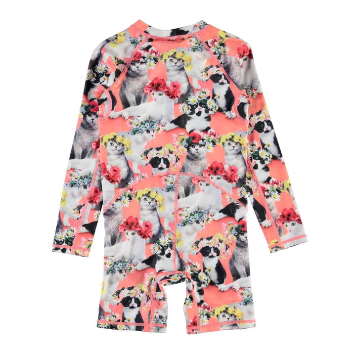A pink floral sun protective onesie for girls by Molo, with a UPF factor of 50+. The soft and stretchy lycra fabric is made from recycled plastic bottles and has a colourful sequins flowers print. There is a chunky front zip fastening.