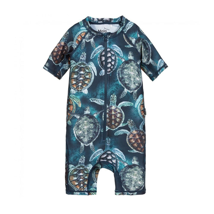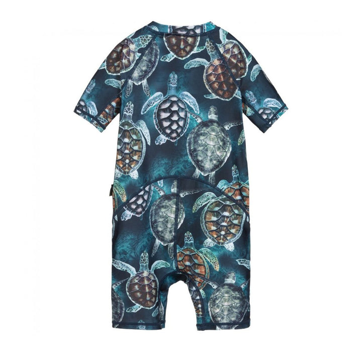 A dark teal blue sun protection onesie for boys by Molo, with a UPF factor of 50+. The soft and stretchy lycra fabric is made from recycled plastic bottles and has a sea turtle print. There is a chunky front zip fastening.
