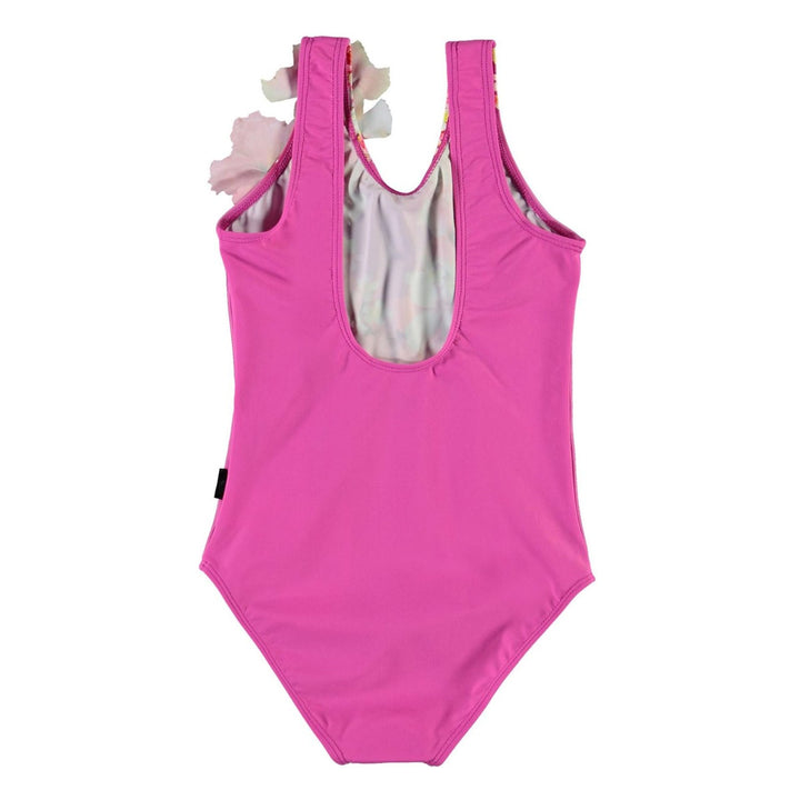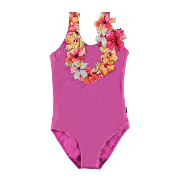 Nika is a classic swimsuit with wide shoulder straps. This Nika style is in fuchsia with a floral wreath print on the front. Molo's swimwear has a UV protection of 50+. This Molo product is recycled and made from REPREVE reusable polyester. REPREVE is the leading, most trusted brand in reusable fibres and is made from used plastic bottles and other waste. The production of recycled polyester utilises far fewer resources and emits less CO2, making Molo’s recycled swimwear a sustainable choice.