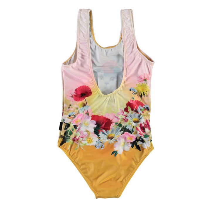 Nika is a classic swimsuit with wide shoulder straps. This Nika style has a humorous print of cats with floral wreaths on their heads. Molo's swimwear has a UV protection of 50+. This Molo product is recycled and made from REPREVE reusable polyester. REPREVE is the leading, most trusted brand in reusable fibres and is made from used plastic bottles and other waste. The production of recycled polyester utilises far fewer resources and emits less CO2, making Molo’s recycled swimwear a sustainable choice.