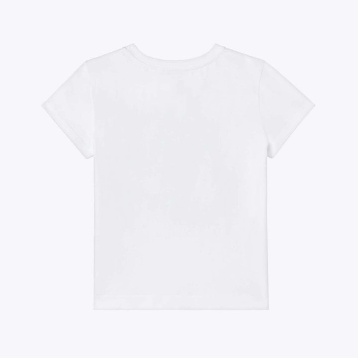 White oversized T-shirt, made from cotton, with short sleeves and ribbed crew-neck. It is embellished with multicolor logo, on the front.