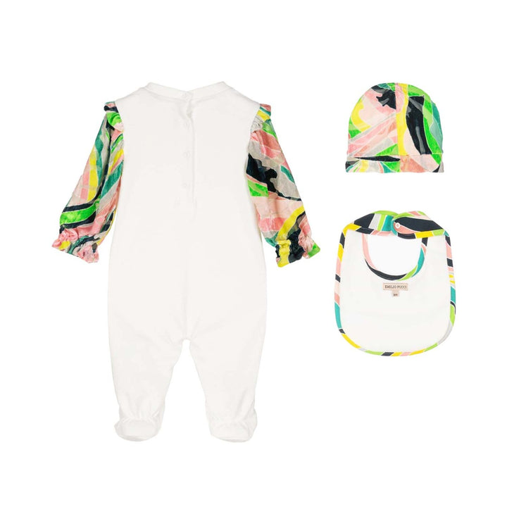 Luxury three-piece white babygrow set for girls by Emilio Pucci, made from soft cotton jersey. The babygrow has the brand's Vetrate print in pink and green on the sheer devor? sleeves. The set includes a beautifully printed double-layer hat and a towelling lined bib.\