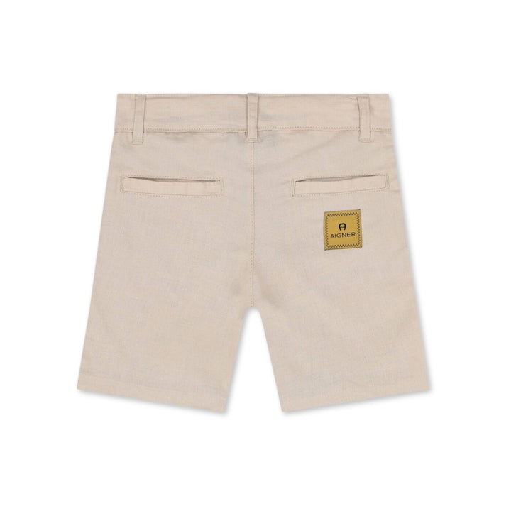 Beige shorts for boys by German designer Aigner. Made from soft cotton, it features the brands logo patch at the back. They have a four pocket styling and a comfortable adjustable waist and concealed zipper fly with top button closure.