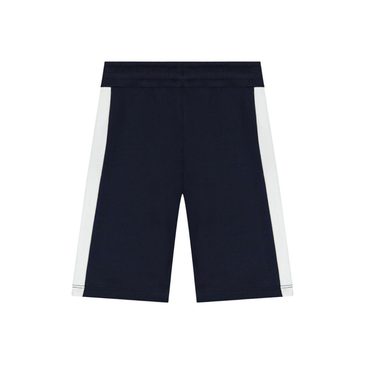 Sporty navy blue cotton shorts for boys by German brand AIGNER, with white stripes on the sides. Bermuda length, they are made in comfortable, lightweight, sweatshirt jersey, and have a ribbed waistband with a logo drawstring for a good fit. There are useful, slanted front pockets and a golden logo patch on one leg for more brand recognition.
