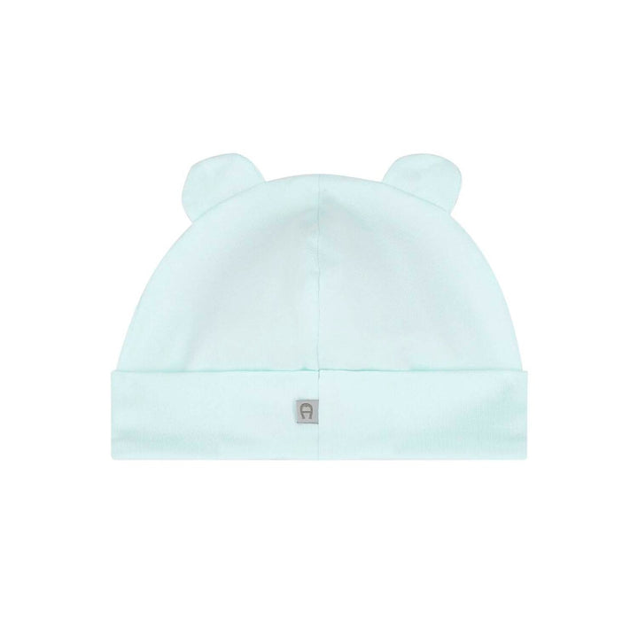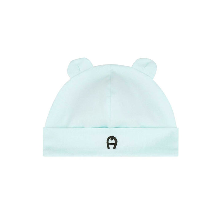 Blue logo baby hat for baby boys by Aigner. Made from super soft Pima Cotton. It features the brand's signature 'A' horseshoe logo embroidered on the brim in navy with a little ears on the top.