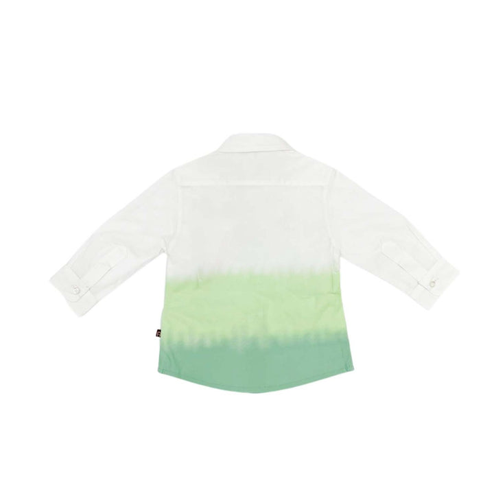 White and green tie-dye shirt for baby boys by AIGNER, made in smooth cotton poplin. It has the designer's signature 'A' horseshoe logo embroidered on the chest in navy blue. There are branded button fastenings down the front, and a small logo tab sewn on the side.