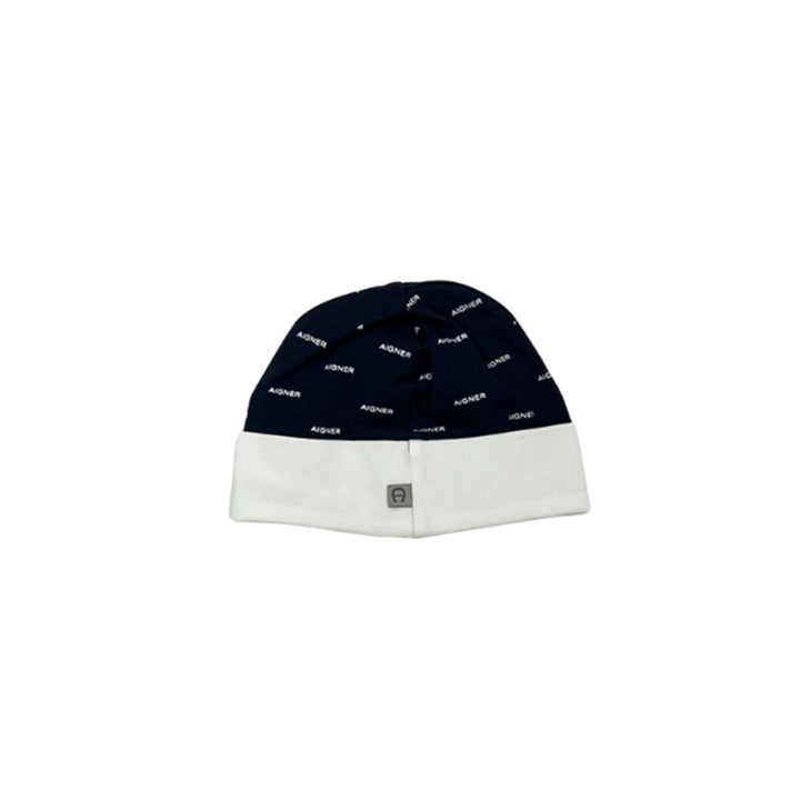 Navy and white logo hat for baby boys by Aigner. Made from soft cotton, it features the brands logo print pattern and embroidered horseshoe logo in white on the brim