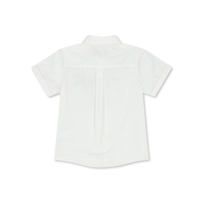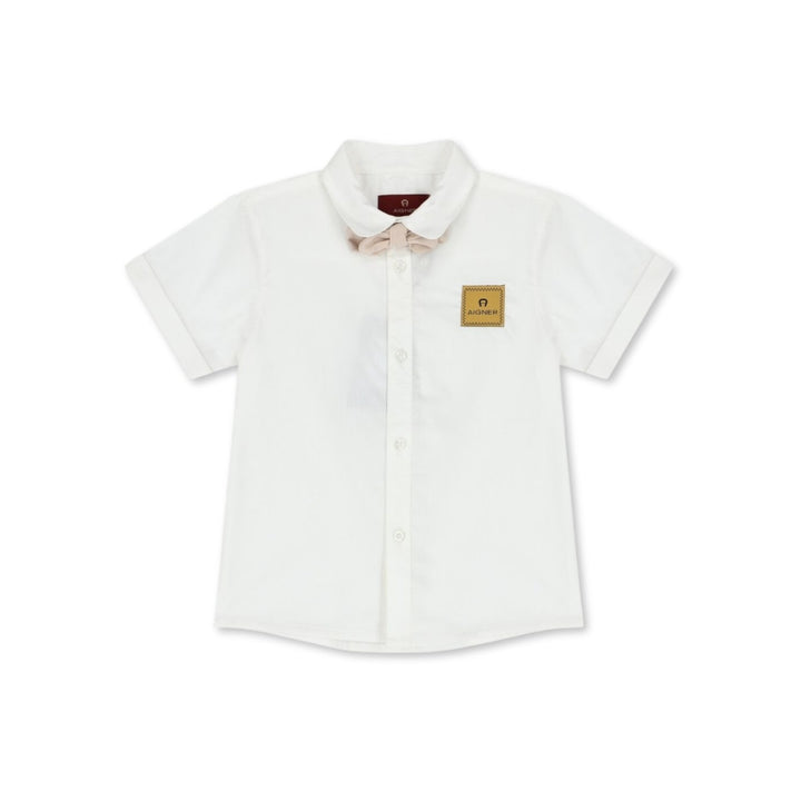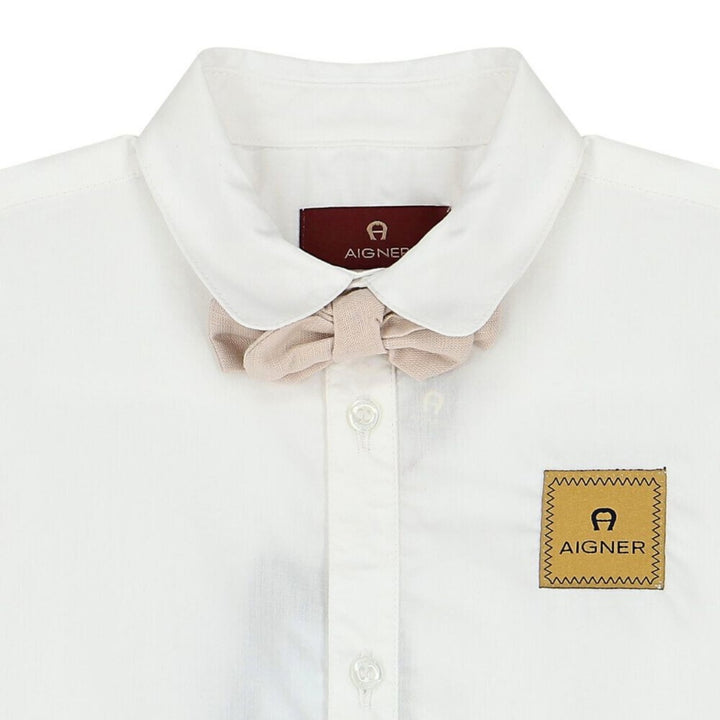 White shirt for baby boys by German designer Aigner. Made from soft cotton, it features the brands logo patch on the chest and beige bow tie. Collared neck with button down closure and long sleeves with buttoned cuffs.