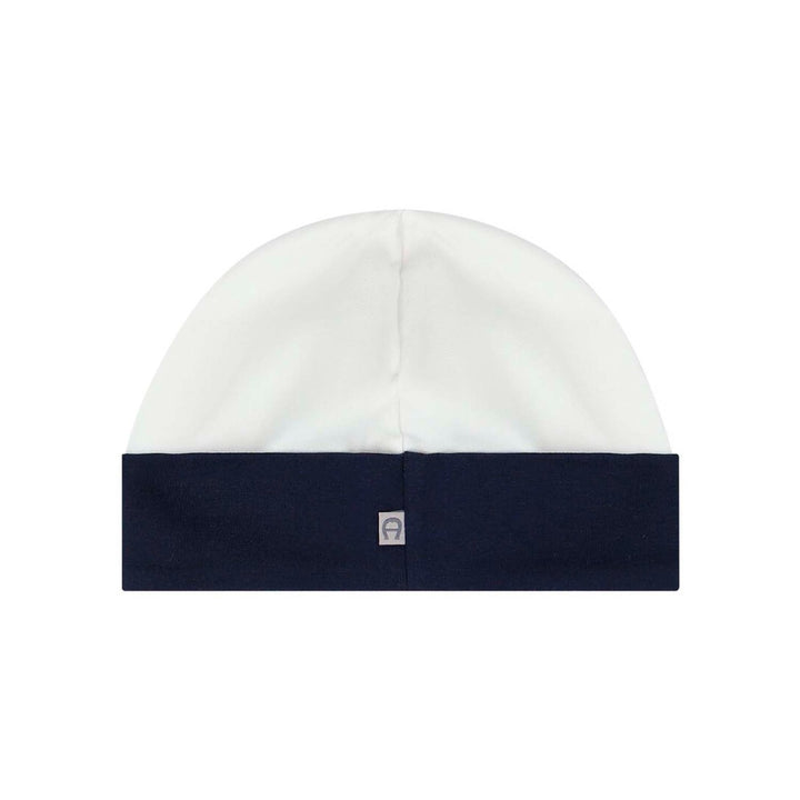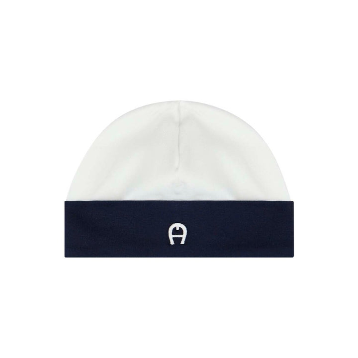 White and navy logo hat for baby boys by Aigner. Made from soft cotton, it has navy brim with the brands iconic horseshoe logo embroidered on the front.