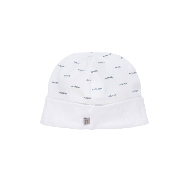 Super soft white Pima cotton jersey baby hat for boys by Aigner. This lovely layette hat features an all-over signature print in navy blue, with an embroidered 'A' horseshoe logo on the brim and a logo tag stitched on the back.