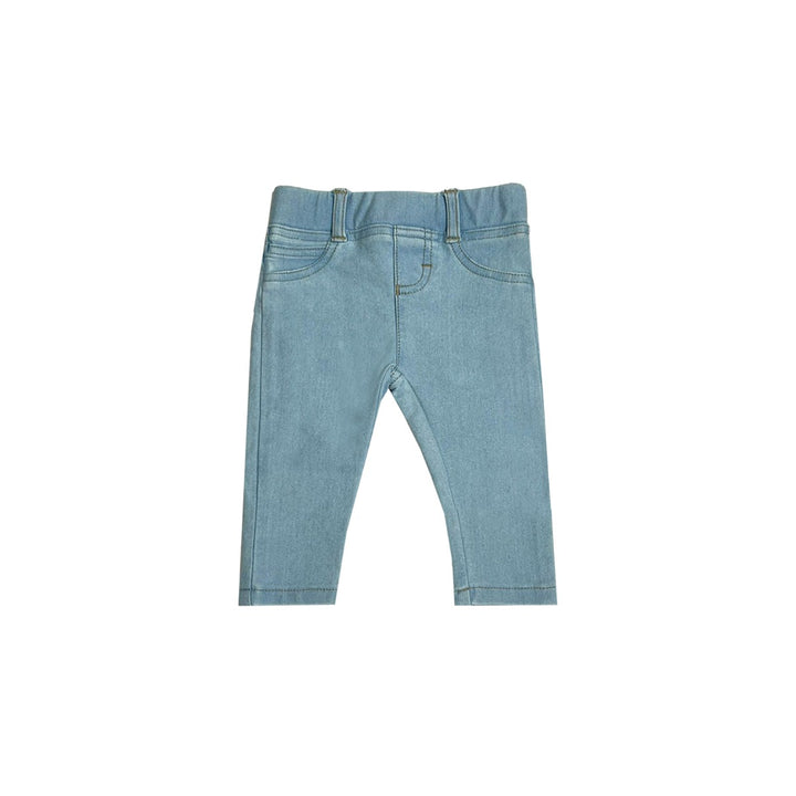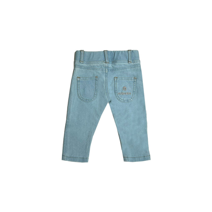 Baby girls pale blue wide leg trousers by German brand AIGNER, made in super soft cotton jersey with the look of denim. Comfortable to wear, they have a stretchy elasticated waistband for a great fit. There are faux pockets on the front and two functional back pockets with signature 'A' horseshoe embroidery for a branded look.