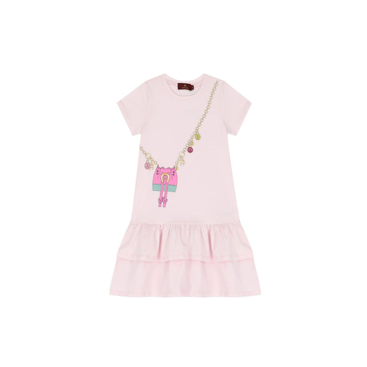 Pale pink cotton dress for baby girls by AIGNER, made in comfortable jersey. It has a pink and grey crossbody bag print, with a gold chain bearing the brand's signature 'A' horseshoe logo charms. The dress is drop-waisted with a gathered skirt and has easy-to-use popper fastenings around the back.