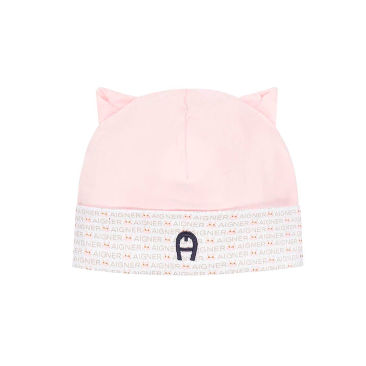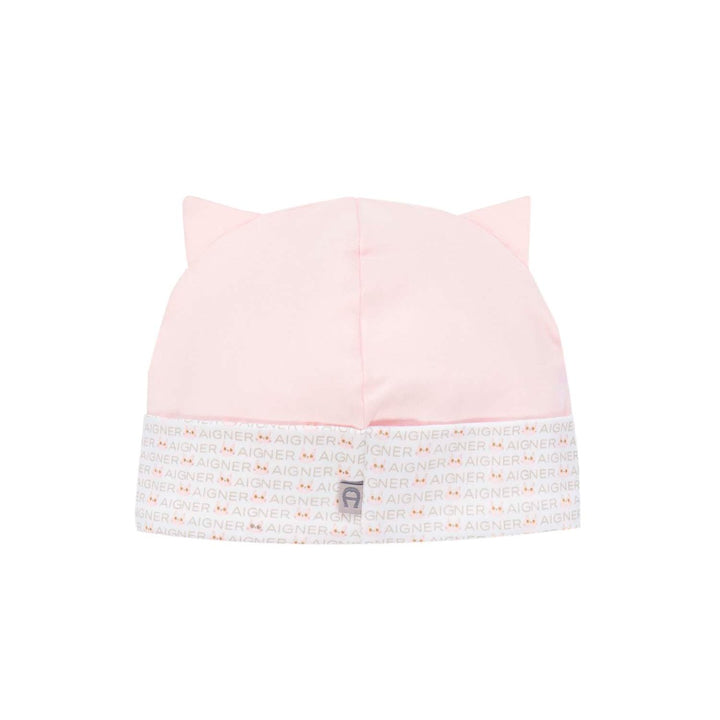 Pale pink hat for baby girls by AIGNER. It is made in super soft Pima cotton jersey, ideal for baby's soft skin, with cute little ears on top. The white brim is patterned in a beige logo and pink cats print, with the brand's signature 'A' logo embroidered in navy blue on the front.