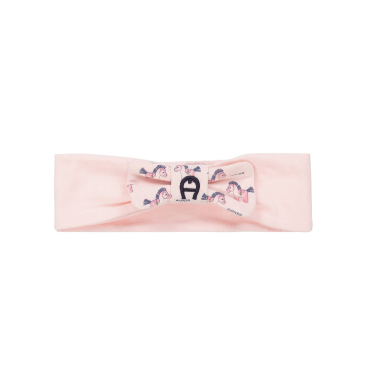 Sweet pale pink headband for baby girls by AIGNER, made in super soft Pima cotton jersey. It has a lovely bow detail on the front, with a cute horse print and an embroidered signature 'A' horseshoe at the centre.