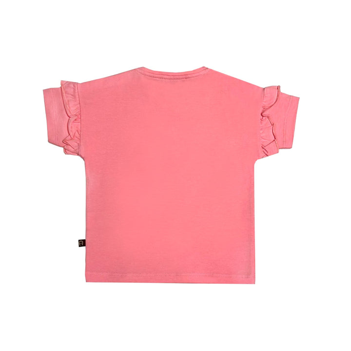 Baby girls pink cotton T-shirt by AIGNER, made in soft jersey, ideal for delicate skin. This sweet top has a glittery gold signature 'A' horseshoe logo print on the front, surrounded by a bold chain design. There are useful popper fastenings on one shoulder for easy dressing and small frill details on the short sleeves for a girly look.