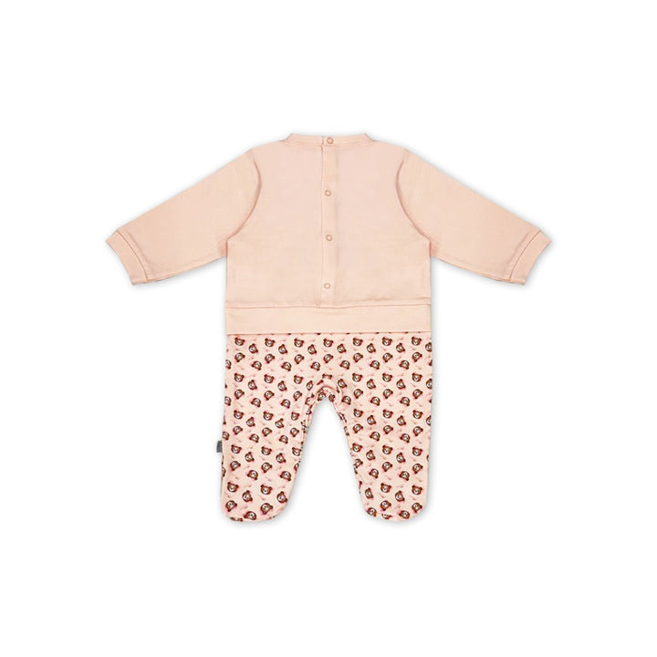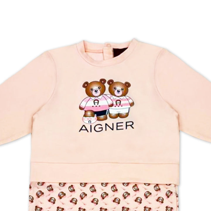 Adorable pink romper for firls by German brand AIGNER, made from super soft and comfortable Pima cotton jersey. It has cute teddy bears wearing rugby outfits printed with the signature 'A' horseshoe logo on the front. Designed to resemble a two-piece, the lower half is patterned with little brown teddy bears and logos. There are popper fastenings on the back and between the legs to make changing easier.