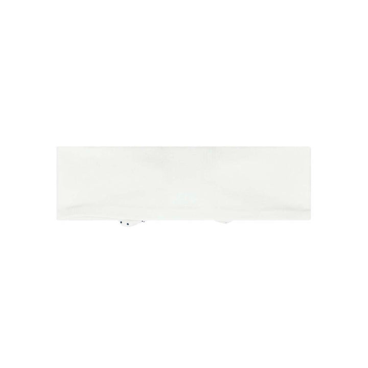 White logo headband for baby girls by Aigner. Made from super soft and stretchy Pima cotton. It features the brown Teddy Bear printed bow on the front with the brand's iconic 'A' horseshoe logo embroidered in navy.