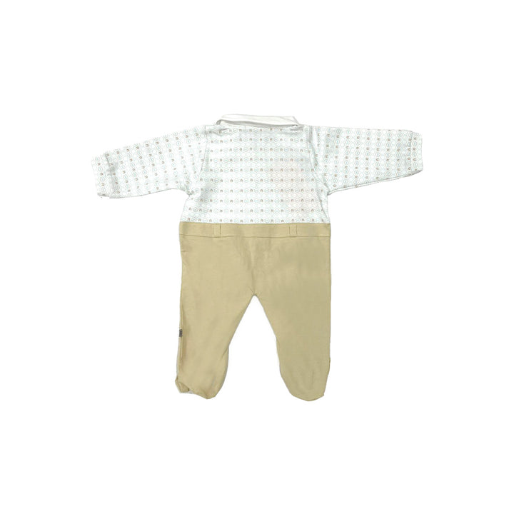 Beige babygrow for boys by luxury German brand AIGNER, made in super soft, comfortable Pima cotton jersey. The babygrow has a half hem print of brand A shape horse on white with a small pocket and A shape horse embroidered on it. It has popper fastenings on the back and between the legs for easy dressing.