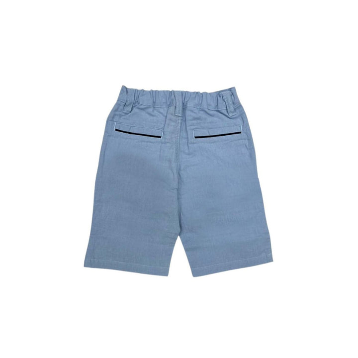 Light blue, Bermuda length shorts for boys by AIGNER. Cool and casual, they have a signature 'A' horseshoe logo patch in gold and navy blue. They are made in lightweight cotton with slanted front pockets, two back pockets and an adjustable waistband. They fasten with a zip and a logo branded button on the front