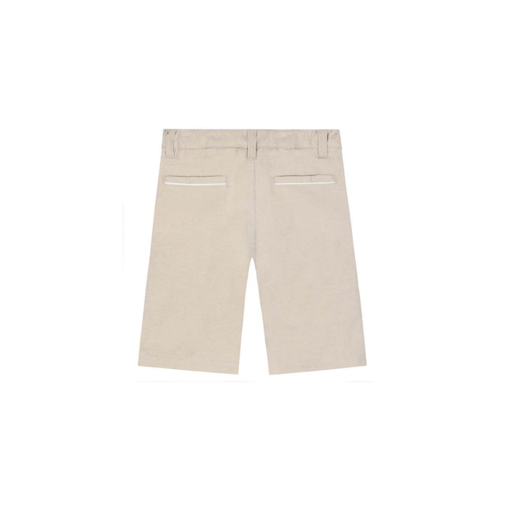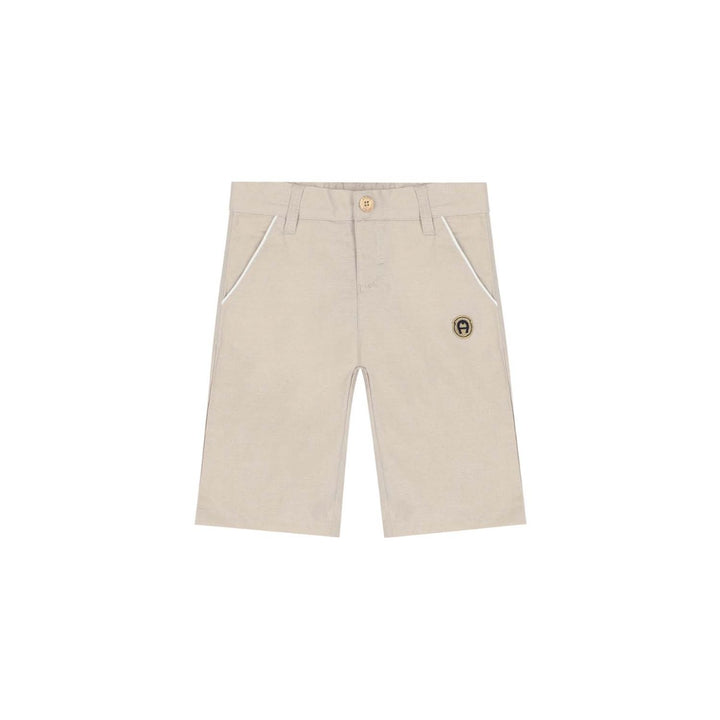 Beige logo shorts for boys by Aigner. Made from soft cotton linen, they feature the brands iconic horseshoe logo embroidered in gold and navy on one side. They have classic four pocket styling with contrast white trims. Finished with a comfortable adjustable waist and concealed zipper fly with top button closure.