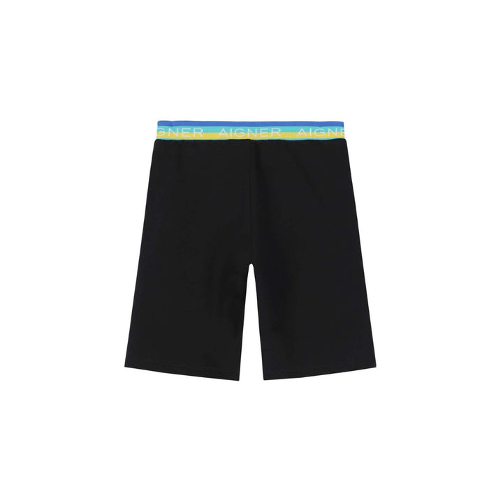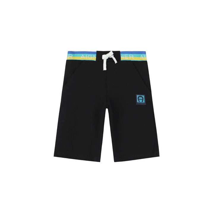 A fun, everyday casual design by AIGNER, a pair of black shorts for boys. They have graphic print on the patch pockets, with the signature 'A' horseshoe logo embroidered in white on one leg. Made in soft cotton sweatshirt jersey in a Bermuda length, they are comfortable with the drawstring waist for a good fit.