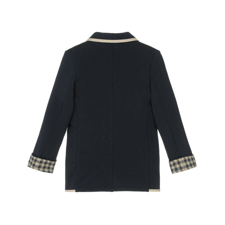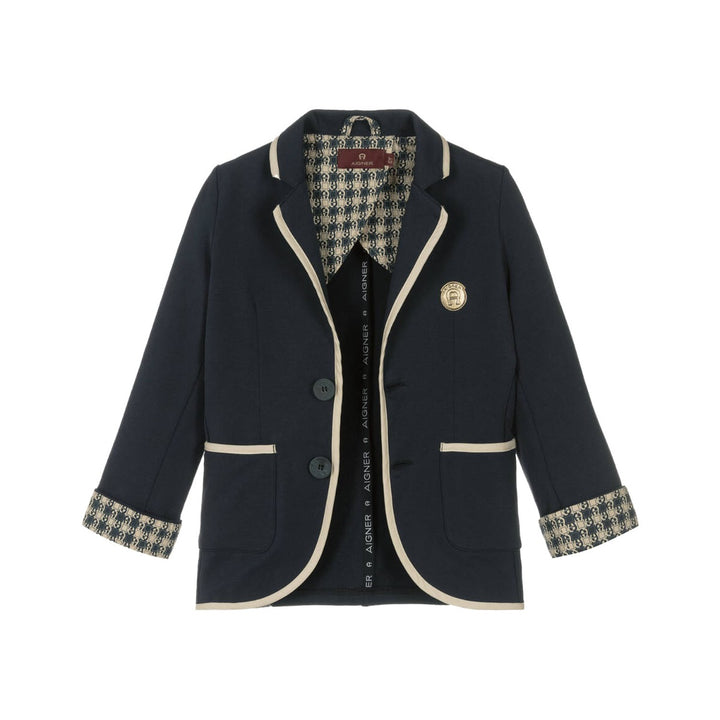 Combining comfort and style, this navy blue AIGNER blazer for boys is made in soft cotton jersey. The brand's instantly recognisable signature 'A' horseshoe logo patch in shiny gold can be seen on the chest and there is branded trim inside the jacket and on the turn-up cuffs. A slim fitted style, it has smart ivory trim, front patch pockets and button fastenings.