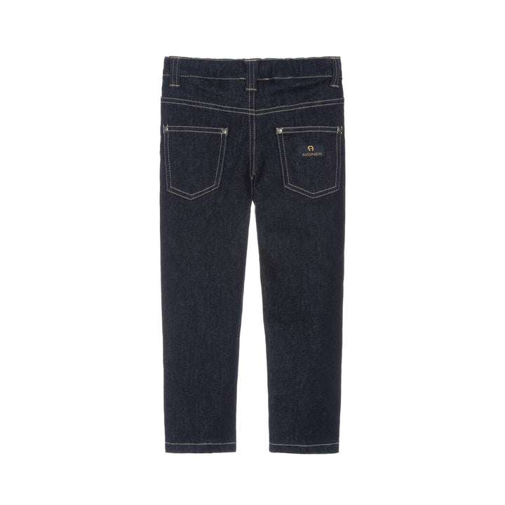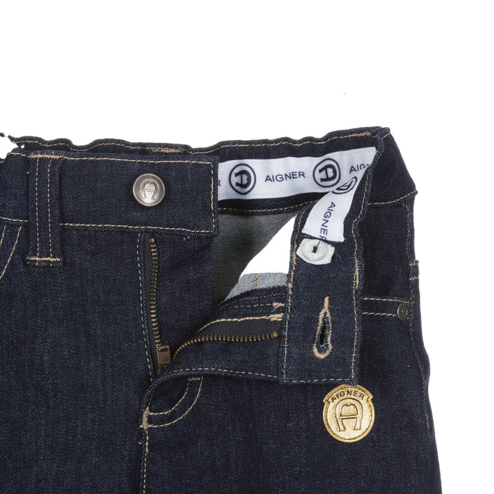 Dark blue jeans for boys by AIGNER, made in soft cotton denim with a slight stretch for comfort. A classic five pocket style, they have a golden logo patch on the front, featuring the signature 'A' horseshoe logo, and a further embroidered logo patch on the back. For a great fit, they have an adjustable waistband and fasten with a zip and branded button.